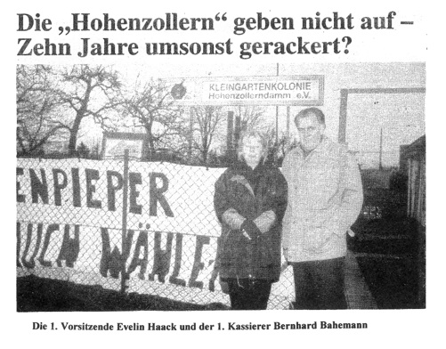 Wir hatten zu dieser Zeit volles Vertrauen zu Herrn Senator a. D. Dr. Hassemer. Nach der Ausweisung unserer Kolonie im FNP-84 als Kleingartengelände und der Aufstellung des Bebauungsplanes durch die Bezirksverordnetenversammlung Wilmersdorf zur endgültigen Absicherung haben wir unverzüglich sehr arbeitsaufwendige Maßnahmen eingeleitet, die hohe Kosten verursachten, aber nach der uns in Aussicht gestellten Anerkennung als Dauerkleingartenkolonie gerechtfertigt waren.