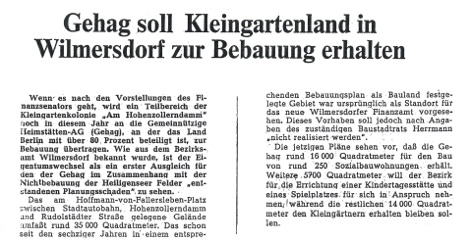 „Der Beirat für Städtebau und Stadtgestaltung bei der Senatsverwaltung für Stadtentwicklung, Umweltschutz und Technologie hat Empfehlungen für den Wohnungsbau auf umstrittenen Flächen in Wilmersdorf, Steglitz und Zehlendorf gegeben. Der Beirat empfiehlt, in seiner Stellungnahme an die Senatsverwaltung, die innerstädtischen Kleingartenflächen, die im Flächennutzungsplan als Wohnbauflächen dargestellt sind, sobald wie möglich für den Wohnungsbau in Anspruch zu nehmen.“