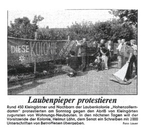 Am 29. Juli 1983 wurden wir durch eine Veröffentlichung im „Tagesspiegel“ schockiert: Der damalige Finanzsenator plante, 60% des Koloniegeländes von Gehag und Bezirk bebauen zu lassen. Von den etwa 35000 m² wären der Kolonie nur noch rund 14.000 m² geblieben.